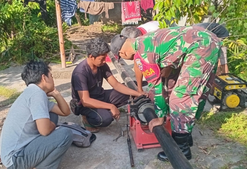 Lombok Utara, NTB — Suara ketukan pipa dan tawa warga berpadu di Dusun Ujung Mekar, Desa Bayan Timur, Kecamatan Bayan, Lombok Utara. Di bawah teriknya matahari, Bintara Pembina Desa (Babinsa) Komando Rayon Militer (Koramil) 1606-03/Bayan, pimpin gotong royong pemasangan pipa air minum jenis HDPE bersama warga dan pihak PDAM Kecamatan Bayan, Jum’at (9/8/2025).