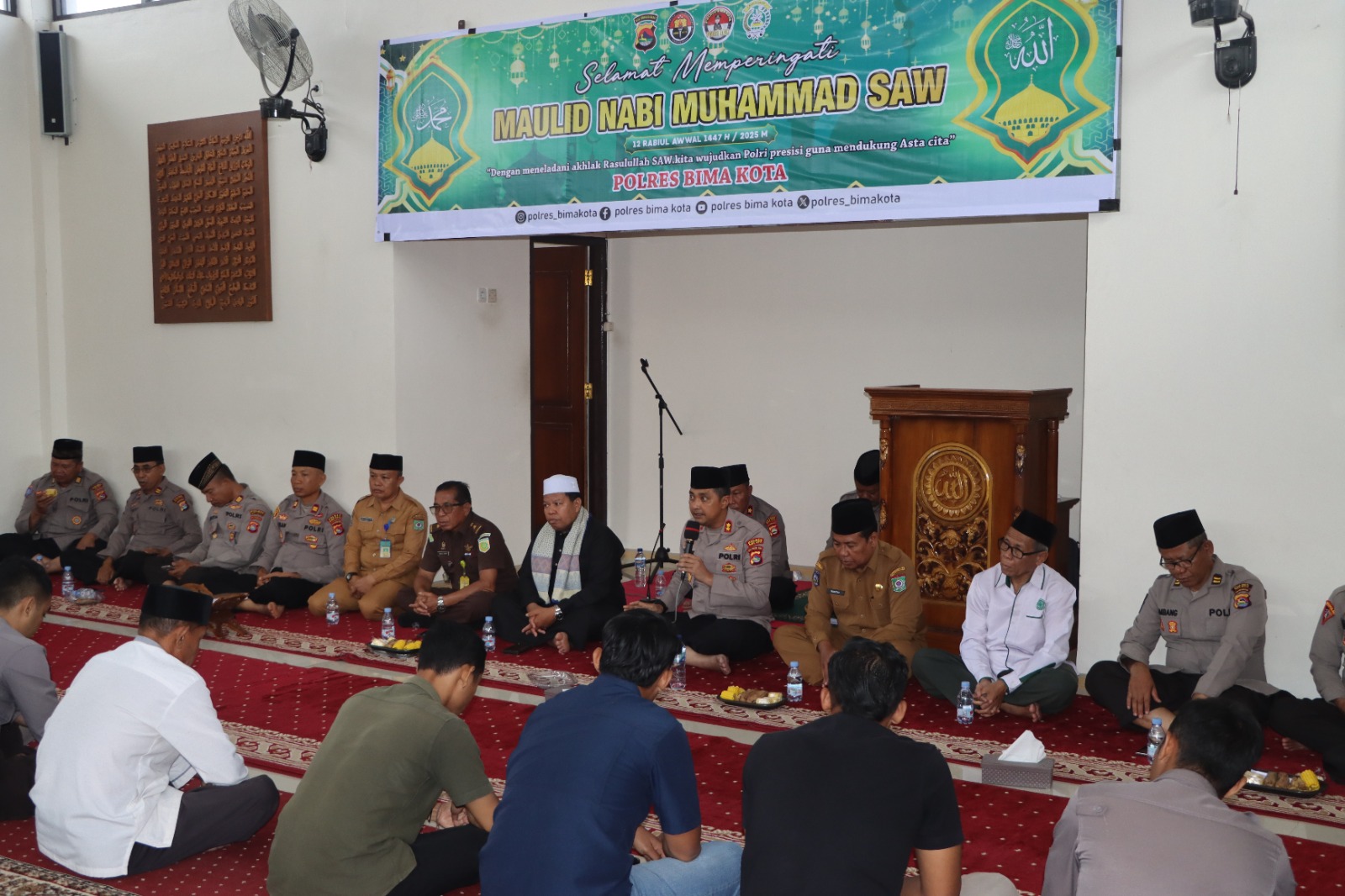 Kota Bima, NTB (09 September 2025) – Polres Bima Kota menggelar peringatan Maulid Nabi Muhammad SAW 1447 H/2025 M pada Selasa (09/09/2025) pukul 08.30 WITA, bertempat di Masjid Jabal Qubis Polres Bima Kota.