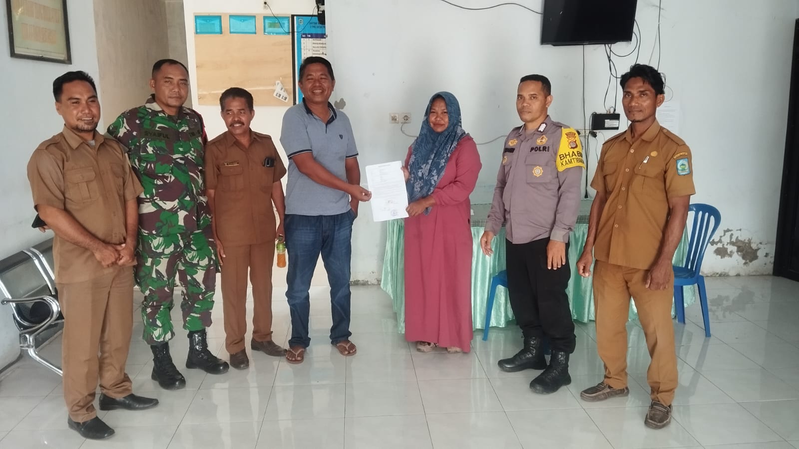 Bhabinkamtibmas Desa Ta’a BRIPKA Ibrahim bersama Bhabinsa Sertu Syaiful memediasi sengketa utang piutang antara Bapak Syukrin dan Ibu Ika Pradipta di Kantor Desa Ta’a.