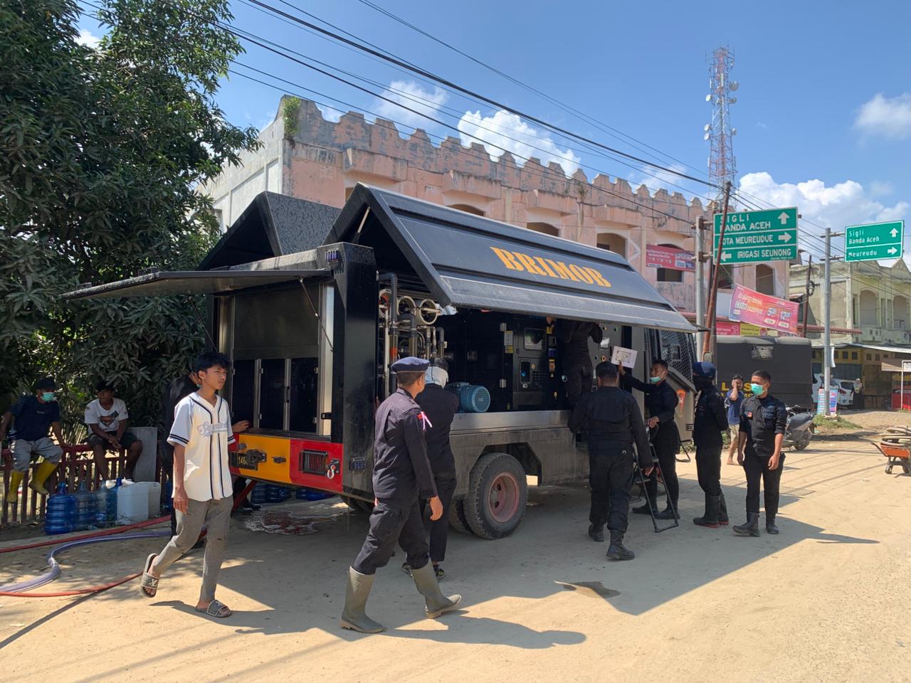 Nagan Raya, Aceh — Personel Kompi 3 Batalyon C Pelopor, Polda Aceh, menyalurkan air bersih dan membagikan masker kepada masyarakat terdampak banjir di Kecamatan Tripa Makmur, Kabupaten Nagan Raya, Sabtu (6/12/2025) pukul 16.00 WIB. Kegiatan kemanusiaan ini dipimpin langsung oleh Wadanki 3 Batalyon C Pelopor, Ipda Ulil Azmi Azwni, S.E.