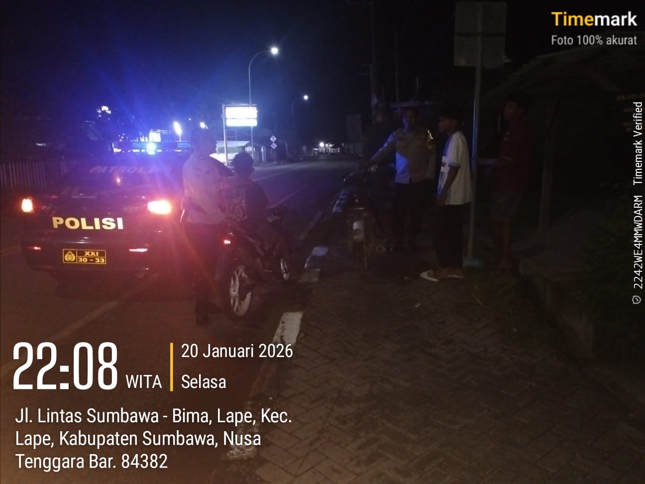 Sumbawa Besar, NTB — Guna menjamin keamanan dan ketertiban masyarakat (Kamtibmas) tetap kondusif, jajaran Polsek Lape Polres Sumbawa meningkatkan intensitas pengawasan melalui patroli Blue Light dan Kegiatan Rutin Yang Ditingkatkan (KRYD). Pada Selasa malam (20/01/2026), personel piket jaga bergerak menyisir titik-titik rawan di wilayah Kecamatan Lape dan Kecamatan Lopok.