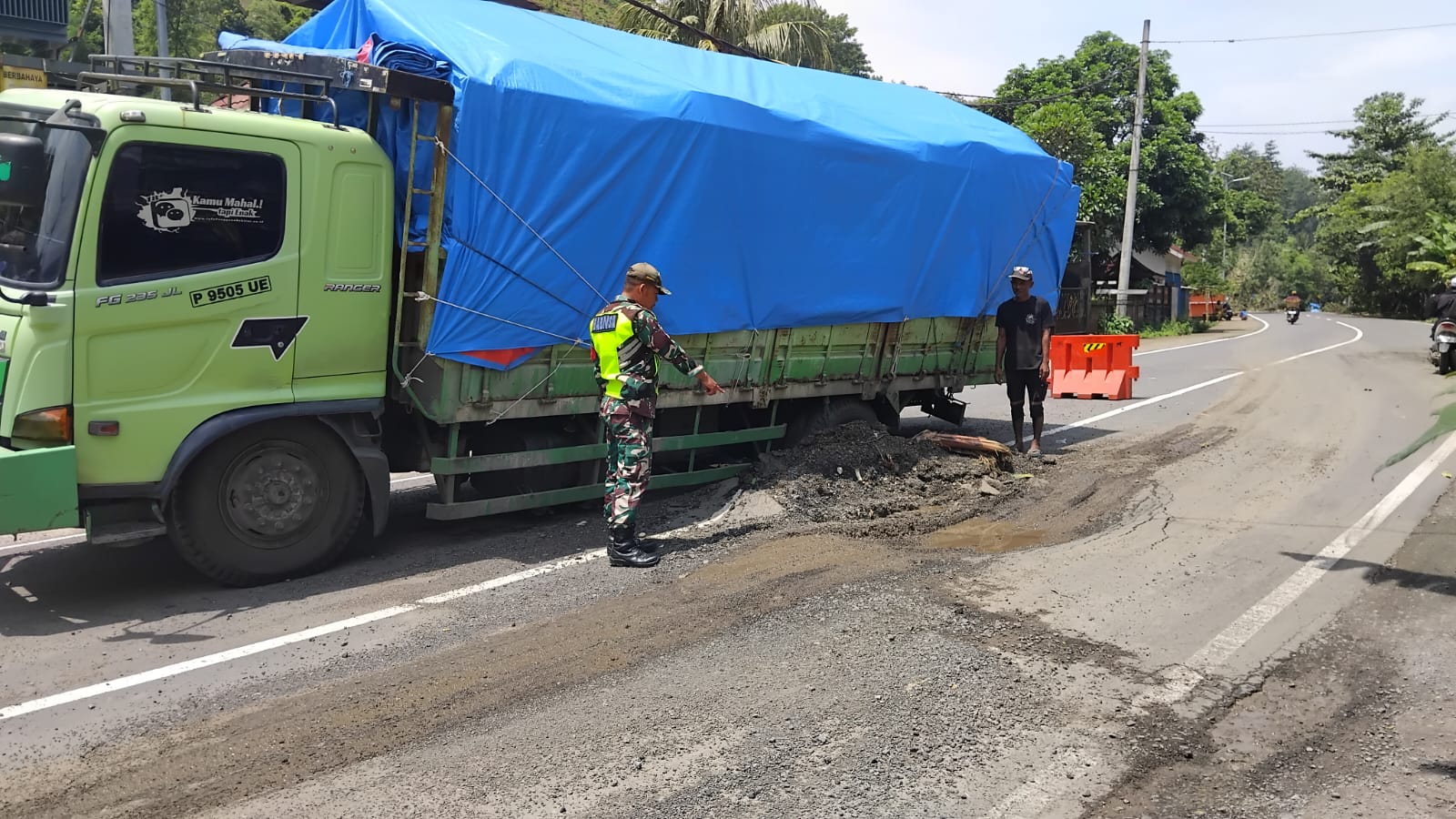 Peristiwa tersebut terjadi saat sebuah truk besar bermuatan gula seberat ±23 ton mengalami amblas pada roda belakang kiri hingga tertanam sekitar 30 sentimeter. Kejadian ini berpotensi mengganggu kelancaran arus lalu lintas, khususnya jalur vital menuju Pelabuhan Gilimas yang menjadi pusat aktivitas bongkar muat logistik.