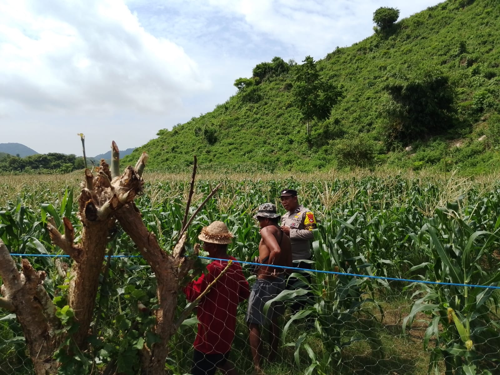 Dalam kegiatan itu, AIPDA Lalu Isnaini bersama warga membantu memasang jaring pelindung pada tanaman jagung yang telah berumur sekitar dua bulan dan mulai berbuah, sebagai upaya mencegah kerusakan akibat serangan hama babi hutan yang selama ini menjadi ancaman serius bagi hasil pertanian warga.