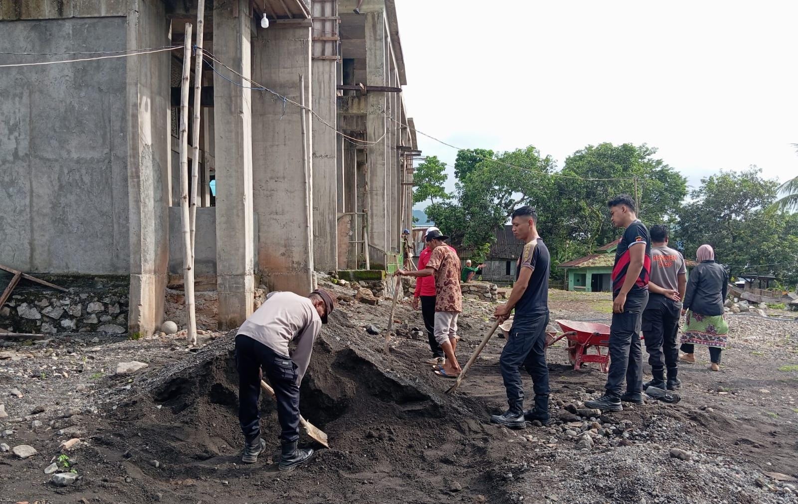 Kebersamaan tersebut tampak terjalin hangat saat aparat kepolisian dan masyarakat bahu-membahu menyelesaikan pekerjaan.