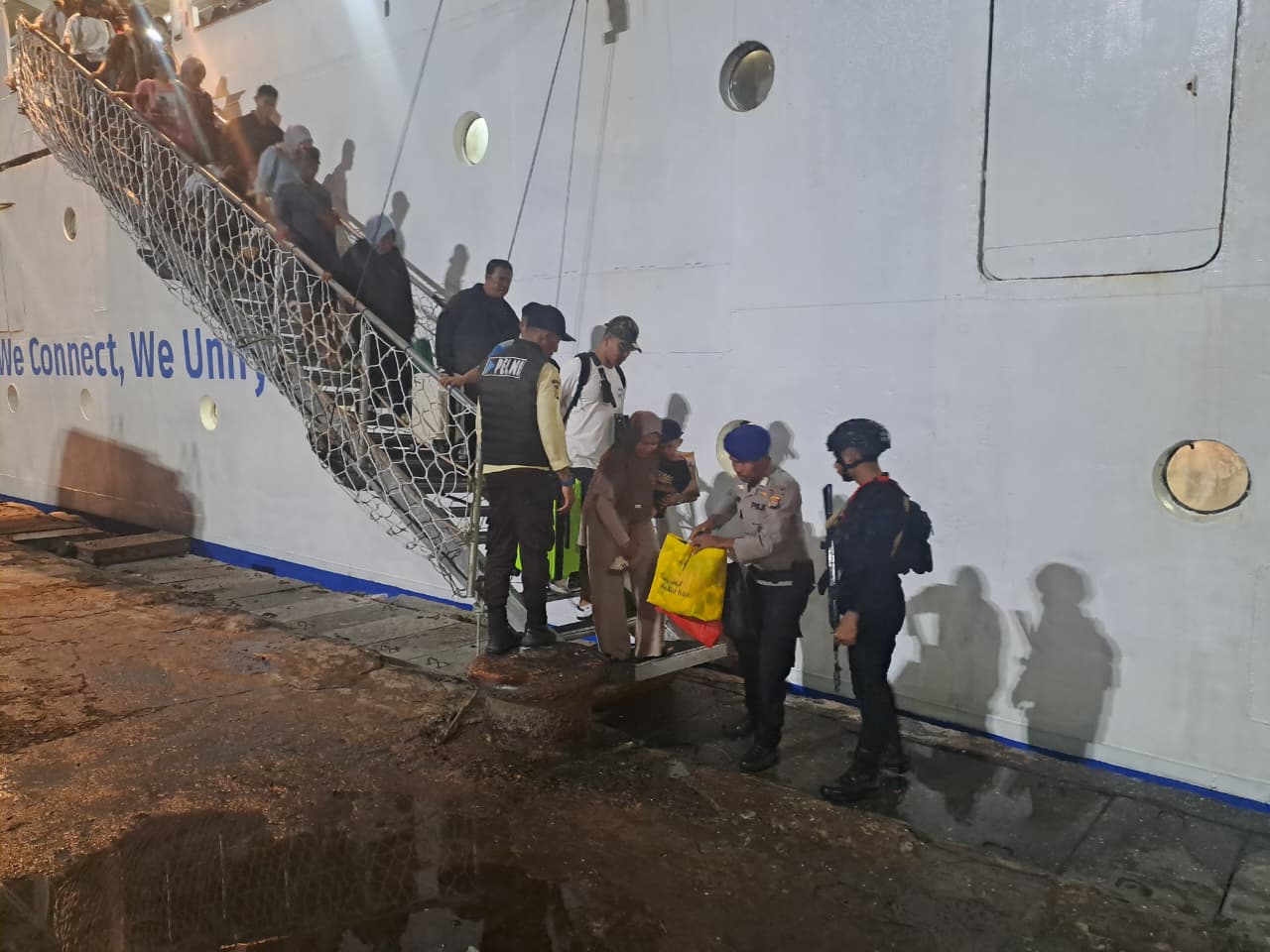 Kapolres Bima Kota AKBP Mubiarto, S.I.K., M.M., melalui Kabag Ops Kompol Dedy Supriyadi, S.H., menjelaskan bahwa personel Ops Ketupat Rinjani 2026 Pos Terpadu Pelabuhan Bima melakukan pemantauan sekaligus pengamanan terhadap kedatangan penumpang Kapal KM AWU yang tiba dari Pelabuhan Waikelo.