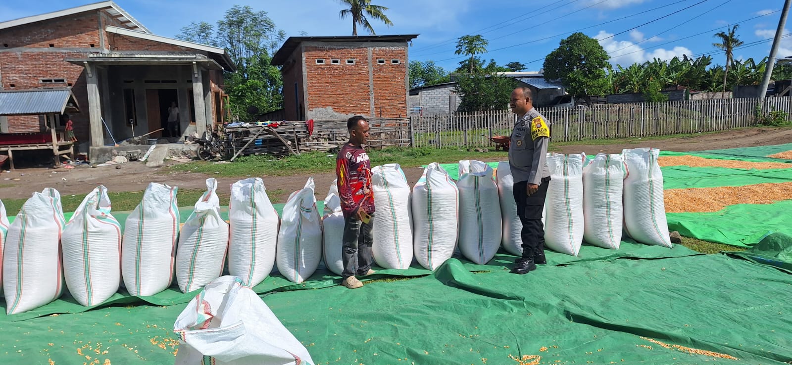 Dalam rangka mendukung Program Ketahanan Pangan Nasional menuju Indonesia Emas 2045, Bhabinkamtibmas (BKTM) Desa Tolokalo, Polsek Kempo, melaksanakan kegiatan pemantauan hasil panen jagung milik warga binaan yang sedang dijemur dan dikemas untuk didistribusikan ke gudang Bulog.