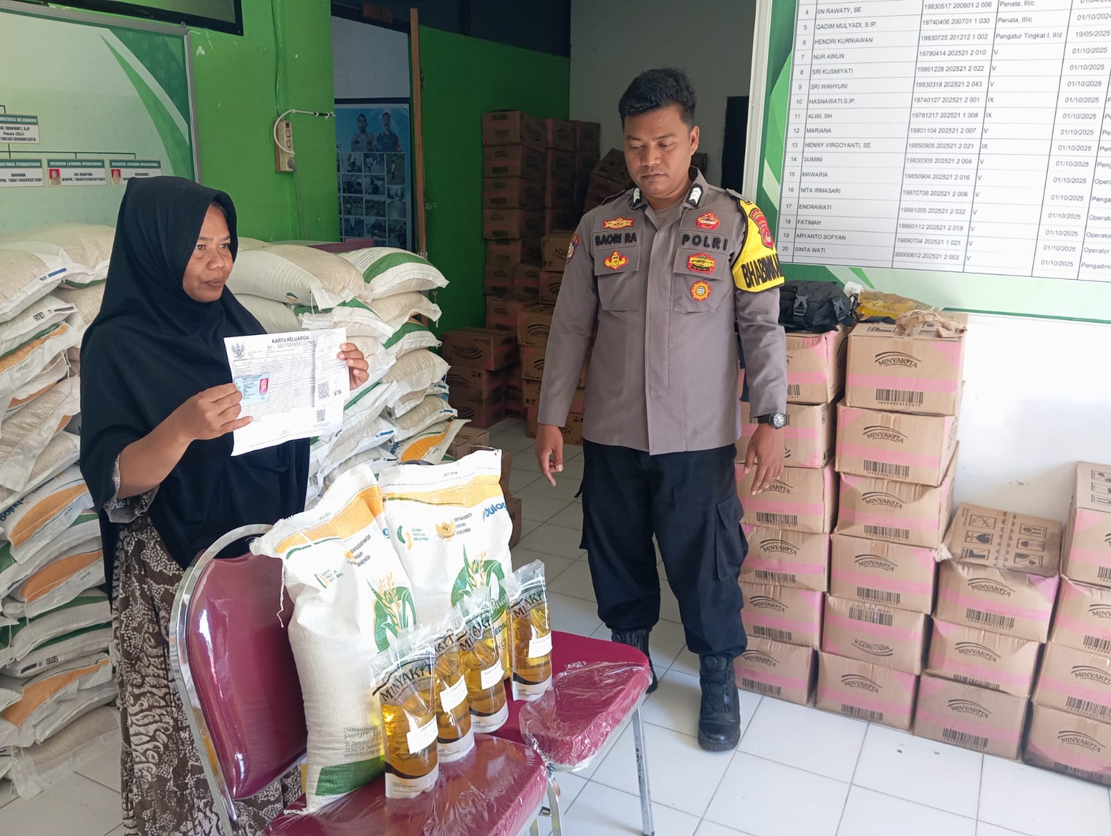 Adapun bantuan yang disalurkan berasal dari BULOG, berupa beras dan minyak goreng. Total bantuan yang didistribusikan meliputi 11.940 kilogram beras dengan kemasan masing-masing 10 kilogram per penerima, serta 2.388 liter minyak goreng dalam kemasan 1 liter per paket.