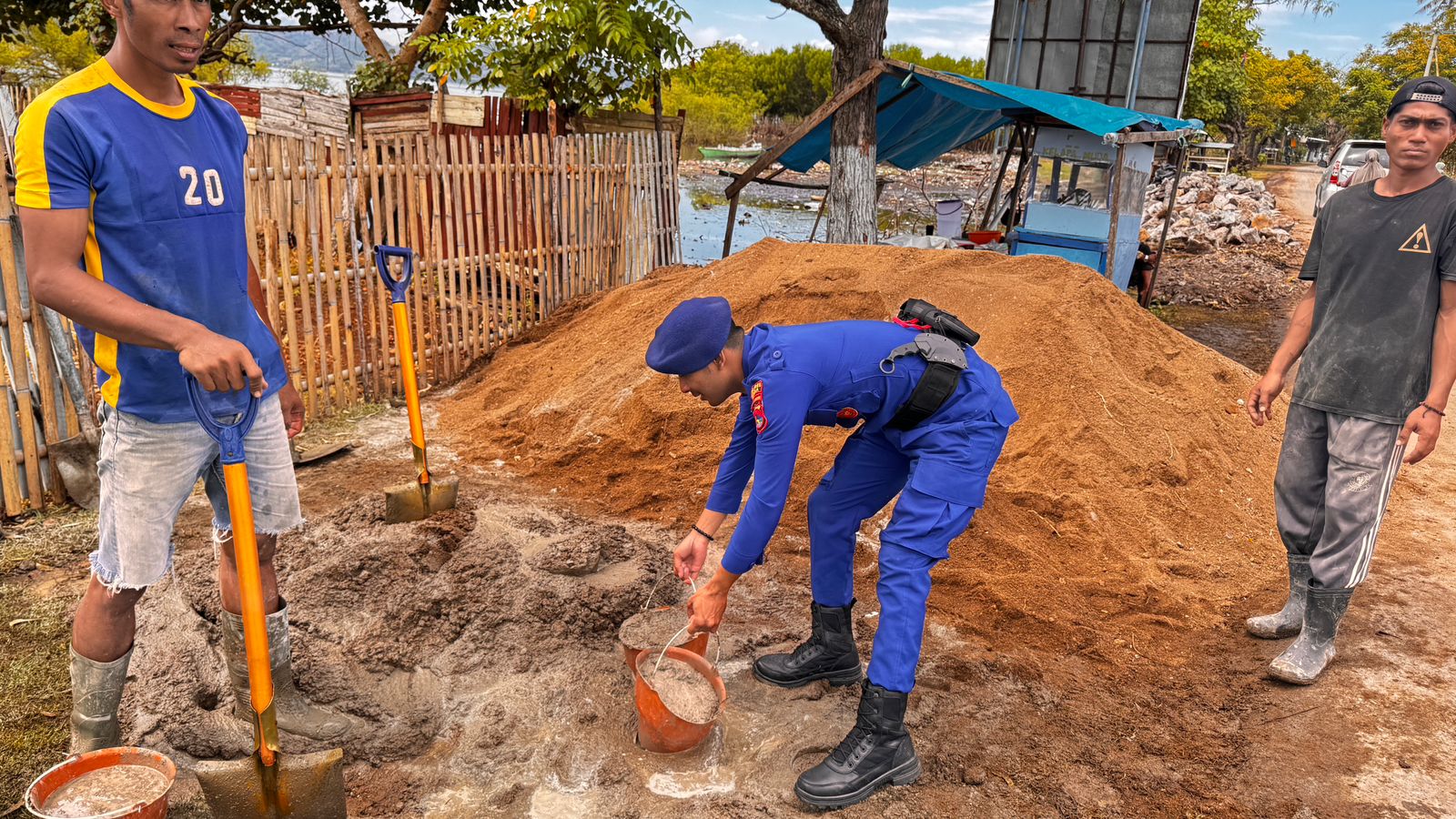 Hal itu ditunjukkan oleh Personel Satpolairud Polres Bima Kabupaten membantu mengaduk semen untuk pembangunan rumah masyarakat.